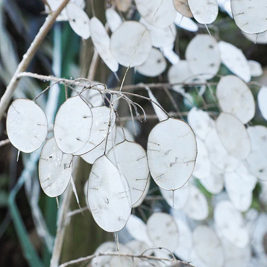 Als de zaden rijp zijn, springen de zaaddozen open. Dan kun je de vliesjes eraf peuteren en zie je de mooie zilverwitte binnenkant. Die kun je heel goed in droogboeketten of droogbloemwerk verwerken. Maak maar eens een krans op met alleen maar korte toefjes gedroogde Judaspenning. Niet alleen leuk om te doen, het ziet er mooi uit en blijft tot vervelens toe goed! Om je krans een tweede leven te geven, steek je er zo tegen kerst, sneeuwwitte kerstballetjes tussen en drapeer je er van die hele kleine ledlampjes tussen. Echt wel leuk!